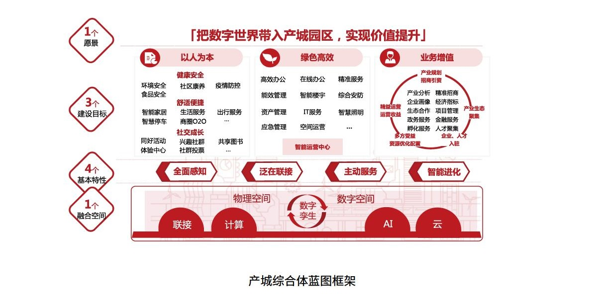 從"智生產(chǎn)"、"智生活"和"智交通"三個(gè)維度,列示未來(lái)智慧產(chǎn)城綜合體應(yīng)具備的要素與特征,指導(dǎo)智慧園區(qū)規(guī)劃與建設(shè),打造業(yè)務(wù)多樣化、設(shè)施智能化、管理數(shù)據(jù)化和服務(wù)主動(dòng)化的產(chǎn)城綜合體。